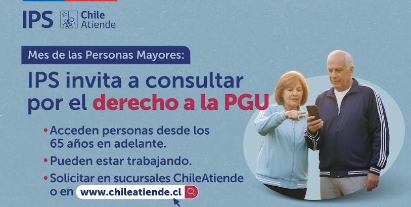 El IPS hace un llamado a las personas desde los 65 años en adelante, trabajen o estén pensionadas, para que consulten si cumplen los requisitos y accedan a la Pensión Garantizada Universal. El beneficio se puede pedir en sucursales ChileAtiende, por videoatención o en línea en www.chileatiende.cl.
