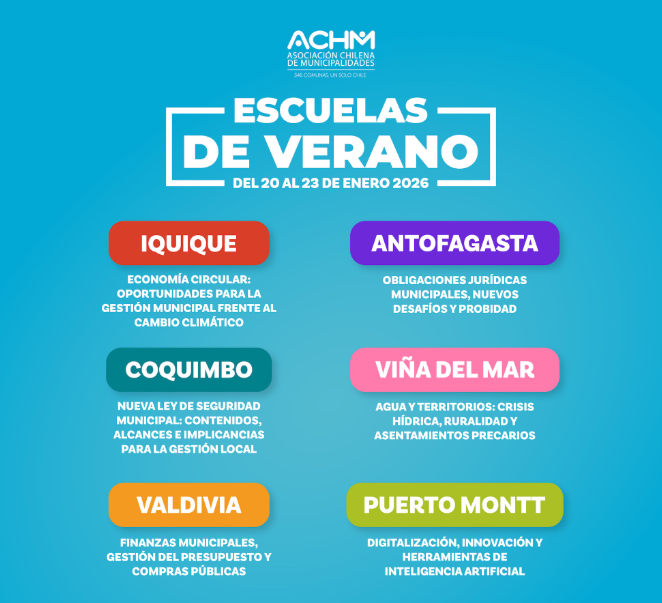 ESCUELAS VERANO ACHMLas jornadas de trabajo se realizarán entre el 20 y el 23 de enero en Iquique, Antofagasta, Coquimbo, Viña del Mar, Valdivia y Puerto Montt, y tienen como objetivo entregar herramientas a alcaldes, concejalas y concejales, directivos y equipos municipales para mejorar la gestión local.