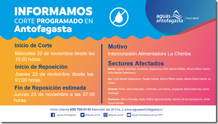 Aguas Antofagasta informa a la comunidad que el próximo miércoles 22 de noviembre se llevará a cabo un corte programado de agua potable en el sector alto norte de la capital regional a partir de las 15:00 horas, iniciando la reposición del suministro a partir de las 01:00 horas, con el fin de la reposición estimada a las 07:00 horas del 23 de noviembre.
