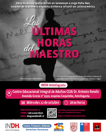 Este miércoles 22 de octubre en el Centro Educacional Integral de Adultos Antonio Rendic, el Instituto Nacional de Derechos Humanos (INDH) exhibirá de manera gratuita la obra de danza teatro “Las Últimas Horas del Maestro”, con que está recorriendo 5 regiones del norte. “Las Últimas Horas” es una obra de danza teatro butoh, que en 48 minutos y con la interpretación de la actriz María Belén Espinosa, directora de la Compañía de Teatro Requiem, desarrolla un recorrido por el último mes de vida de Jorge Peña Hen.
