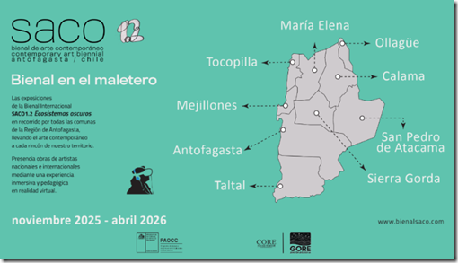 Este proyecto comenzó en el año 2022 con las exposiciones de SACO1.0 Aluvión y continuó en 2024 con una selección de SACO1.1 Golpe. En esta ocasión, por primera vez el recorrido estará en todas las comunas de la región de Antofagasta, haciendo un circuito de 3.500 kilómetros aproximadamente para que las personas interactúen con obras de artistas nacionales e internacionales que conformaron la duodécima edición de la bienal de este año.