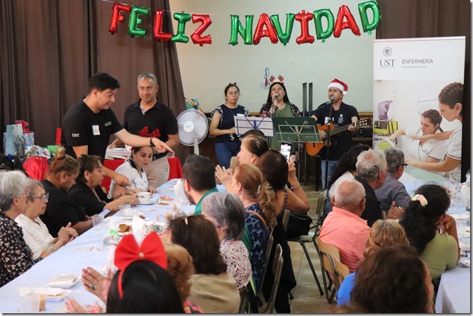 Esta fiesta navideña contó con la colaboración de 15 estudiantes de Enfermería, 5 de Kinesiología y 2 de Gastronomía Internacional, además de donaciones de la carrera Nutrición y Dietética, para brindar un momento agradable con alimentos y un espacio de distensión para las cerca de 50 personas mayores que asistieron.