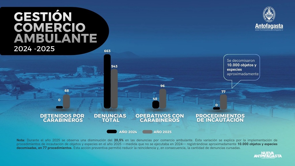 Pasar de no registrar detenidos ni incautaciones en 2024, a 68 personas arrestadas y 77 decomisos —con más de 10 mil especies retiradas— durante 2025, evidencia importantes avances en el control del comercio ambulante, gracias al trabajo conjunto y coordinado entre la Municipalidad de Antofagasta y Carabineros.