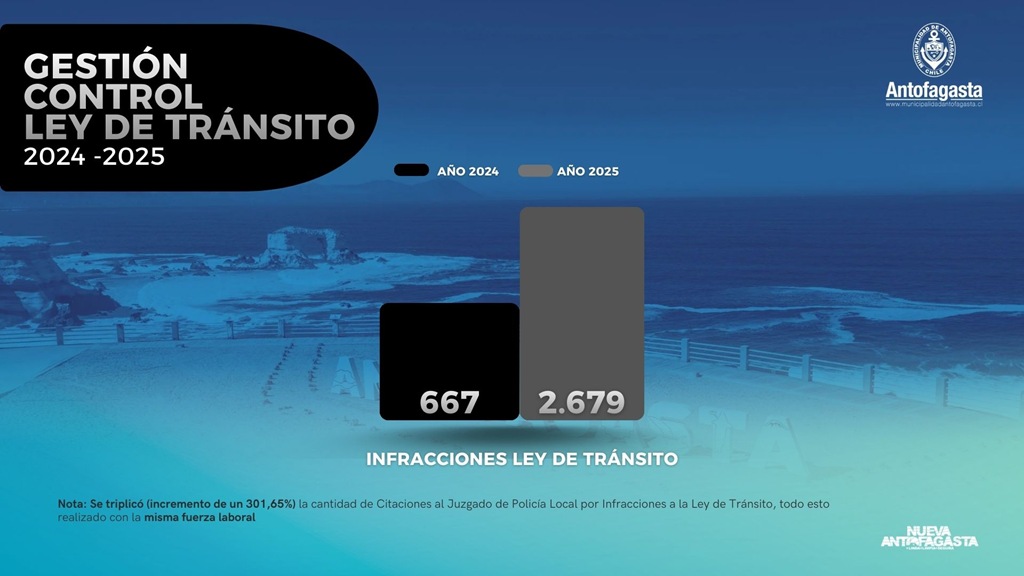 A ello se suma un crecimiento exponencial en lo referido a acciones para el control de la Ley de Tránsito, dado que se triplicó (incremento de un 301,65%) la cantidad de citaciones al Juzgado de Policía Local por Infracciones a la normativa.  El 2024 se contabilizaron 667 citaciones, mientras que el 2025 hubo 2.679.