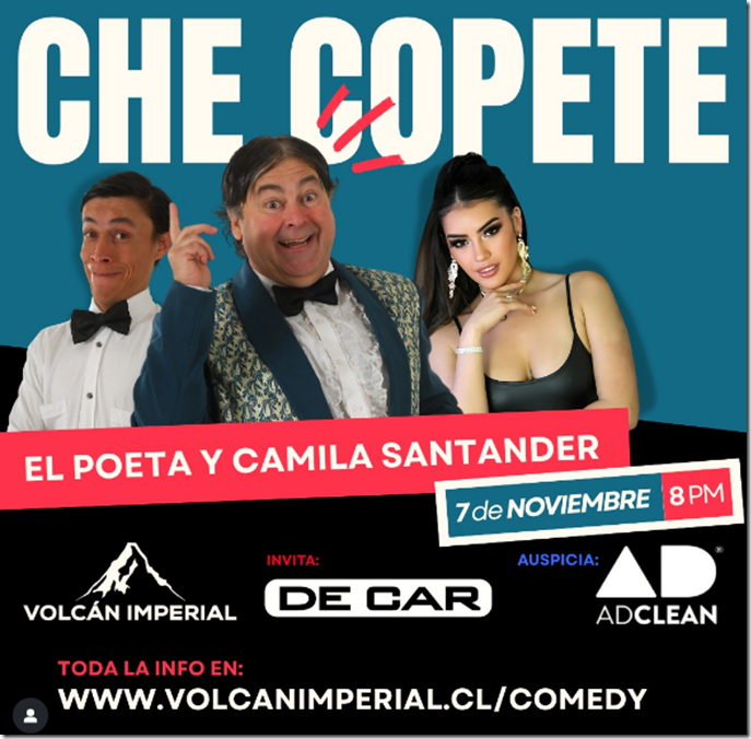 El show contará con la participación estelar de Ernesto Belloni, conocido por su personaje “Che Copete”, quien compartirá escenario con El Poeta y Camila Santander, conformando una triada de comediantes que mezclan todo su talento para entretener y sacar más de una carcajada.