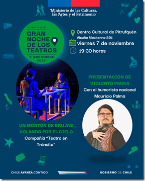 La actividad es organizada por la Seremi de las Culturas, las Artes y el Patrimonio de La Araucanía y contará con la participación de la Compañía “Teatro en Tránsito”, con la obra: “Un montón de brujas volando por el cielo”, la dramaturga chilena Carla Zúñiga. Esta relata la historia de dos mujeres que se encuentran disputando la presidencia de un fan club. En el camino irán indagando en sus propias soledades y fracasos, cuestionando las estructuras de poder, la marginalidad y el significado de la libertad. Temas como la empatía, la sororidad y la compasión son parte de este viaje hacia lo más profundo del ser humano. Un montaje que nos muestra lo distantes que pueden estar dos personas y aun así encontrar aquellos puntos en común que permiten que surja la empatía.