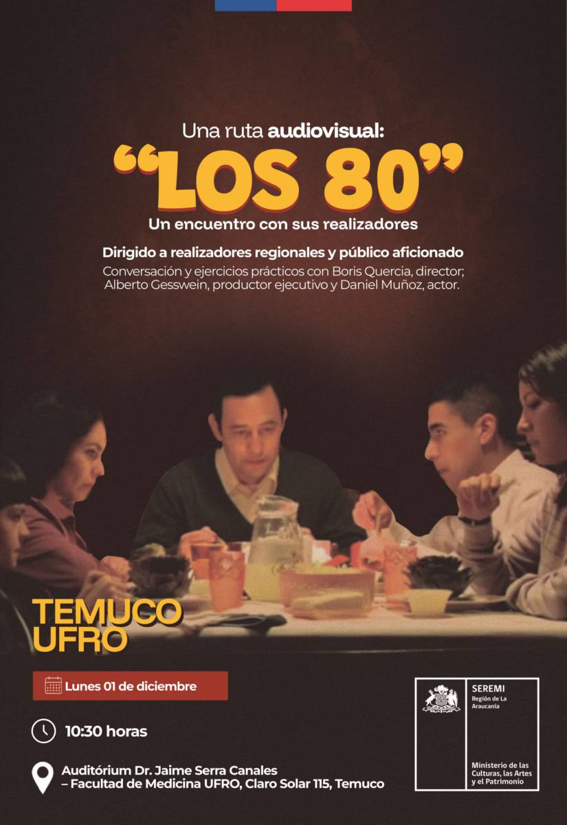 Este homenaje al cine nacional finaliza el lunes 1 de diciembre, a las 10.30 horas, en el salón Auditórium de la Facultad de Medicina de la Universidad de La Frontera en Temuco, con: Una ruta audiovisual “Los 80”, un encuentro con el equipo de la serie de televisión donde estarán el productor Alberto Gesswein, el director Boris Quercia y el actor Daniel Muñoz.