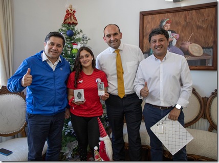 El alcalde Ricardo Jaramillo, junto al coordinador de Educación Municipal, Edison Tropa, y el director del Liceo Jorge Teillier Sandoval, Eduardo Morales, se reunieron con la deportista y estudiante de 3° año H, Martina Venegas Salazar, para entregar un importante aporte destinado a fortalecer su carrera deportiva.