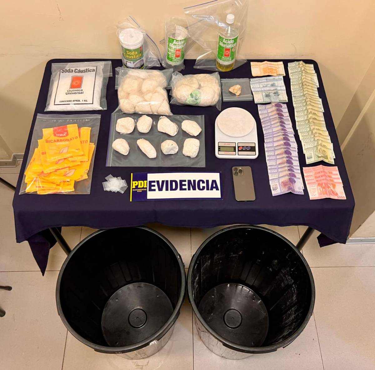 En el procedimiento policial se incautaron 3.581,99 gramos de cocaína base, dinero en efectivo, equipos celulares de alta gama, envases y envoltorios de soda cáustica, ácido muriático y bicarbonato de sodio en polvo, contenedores de basura en el que procedían a mezclar estos insumos para abultar la droga.