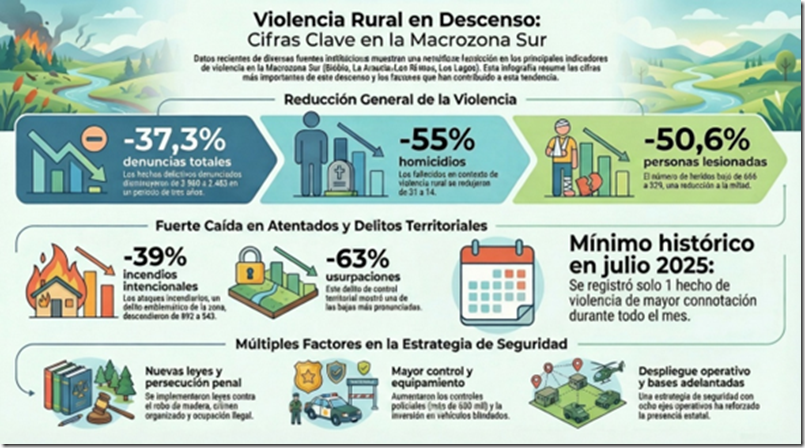 Según el Informe de Violencia Julio 2025 de la Multigremial de La Araucanía, durante ese mes se registró un solo hecho de violencia de mayor connotación en la Macrozona Sur, lo que representa una disminución interanual de 83% respecto de julio de 2024. Se trata del nivel mensual más bajo desde la instauración del Estado de Emergencia Constitucional en la zona.