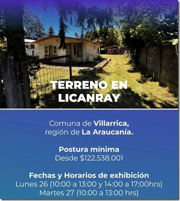 El inmueble que será rematado se encuentra ubicado en Hugolino Lillo N°218, Lote 2B-1, Licanray, comuna de Villarrica, región de La Araucanía, y cuenta con una postura mínima de $122.538.001.