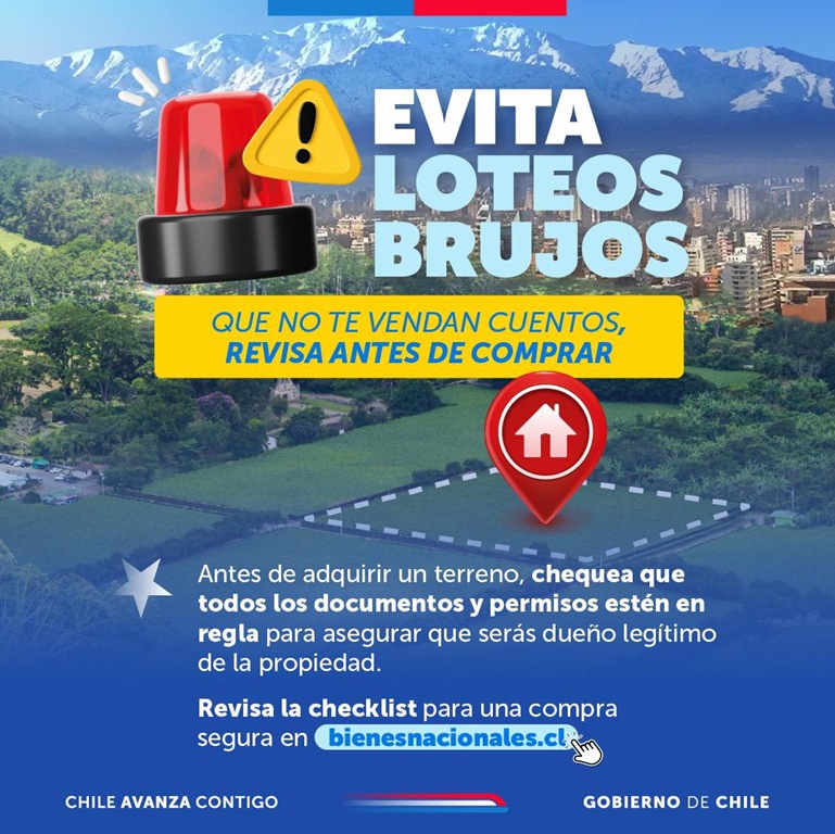 El Ministerio de Bienes Nacionales lanzó la campaña “Haz tu checklist para una compra seguraque busca prevenir a la ciudadanía sobre los riesgos de los llamados loteos brujos y promover compras informadas y responsables. El checklist permite guiar a las y los interesados en los trámites y certificados que deben revisar en distintas instituciones públicas, evitando así ser parte de subdivisiones irregulares que podrían derivar en la imposibilidad de obtener el Título de Dominio ante el Ministerio de Bienes Nacionales.
