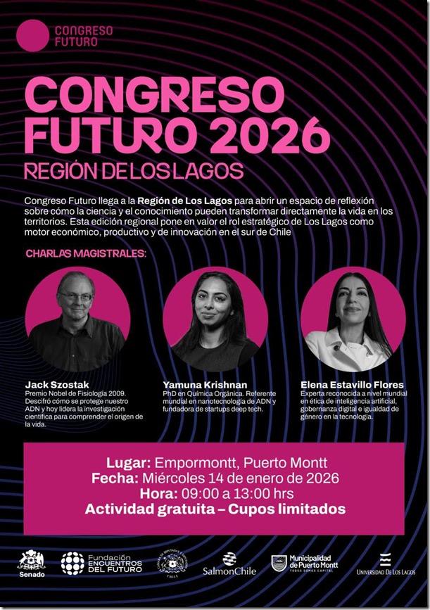 La versión 2026, se realizará el día miércoles 14 de enero de 8.30 a 13 horas en Empormontt en Puerto Montt y contará con la participación de Jack Szostak (Premio Nobel de Fisiología 2009): Descifró cómo se protege nuestro ADN y lidera investigaciones para comprender el origen de la vida; Yamuna Krishnan (PhD): Referente global en nanotecnología de ADN y fundadora de startups de Deep Tech. Su trabajo transforma el ADN en nano-herramientas capaces de monitorear procesos biológicos en tiempo real, abriendo nuevas rutas para el bienestar animal y la sostenibilidad global; y María Elena Estavillo (PhD): Experta reconocida mundialmente en ética de inteligencia artificial, gobernanza digital e igualdad de género en la tecnología.