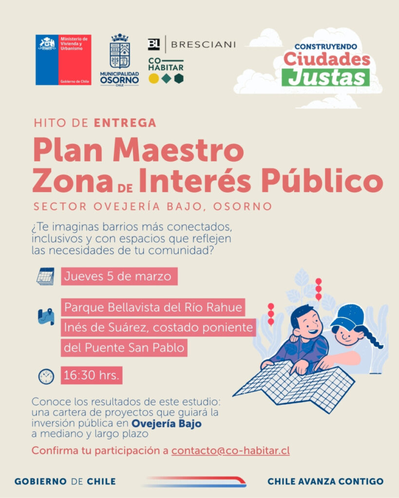 Una invitación abierta a todas las vecinas y vecinos de Osorno se realizará esta semana para conocer y ser parte del futuro de uno de los sectores con mayor potencial de desarrollo de la ciudad. Se trata del Hito de Devolución del Plan Maestro Zona de Interés Público (ZIP) Ovejería Bajo, instancia que se desarrollará en el Parque Bellavista del río Rahue.