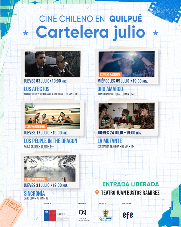 Al respecto, Sebastián Cartajena , programador de Quilpué Audiovisual, señala: “Queremos invitar a todos los habitantes de Quilpué a ser parte de esta programación que durante julio presentará cuatro estrenos nacionales que nos hablan del buen momento del cine chileno, sobre todo en cuanto a la diversidad de géneros cinematográficos y temáticas abordadas. Además, en todas las funciones contaremos con importantes invitados e invitadas que refuerzan la idea de generar espacios de diálogos con los públicos asistentes”.