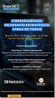 El bloque final incluirá una mesa redonda moderada por Óscar Araya, Subdirector de la Escuela de Informática y Telecomunicaciones de Duoc UC, junto a los expositores y la Directora de Escuela, Alejandra Acuña, quien compartirá la visión institucional sobre la formación de talento en ciberseguridad.