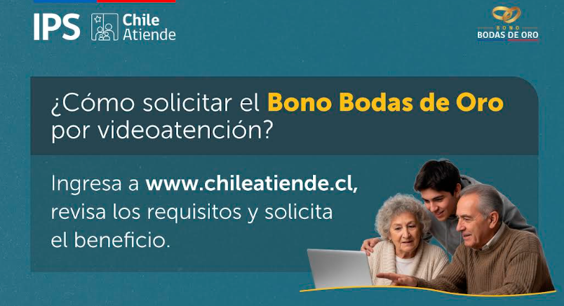 El Instituto de Previsión Social (IPS) hace un llamado a las más de 5 mil personas a nivel nacional, que tendrán derecho al Bono Bodas de Oro entre octubre y diciembre de este año 2025, al cumplir 50 años de matrimonio, junto con los demás requisitos. El trámite se puede hacer de forma rápida y simple por medio de la videoatención en los sitios www.chileatiende.cl o www.ips.gob.cl, y lo deben solicitar ambos cónyuges de manera conjunta.