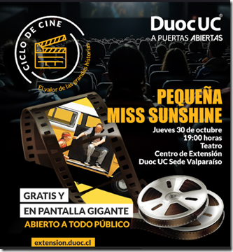 imagePor petición del público, el Centro de Extensión Duoc UC Sede Valparaíso volverá a presentar en su pantalla grande “Little Miss Sunshine”, dentro del ciclo de cine “El valor de las grandes historias”, parte de la Cartelera Cultural A Puertas Abiertas, que busca acercar el arte y la cultura a la comunidad a través de grandes producciones del séptimo arte.