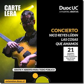El Centro de Extensión de Duoc UC Sede Valparaíso suma un nuevo hito a su cartelera cultural con la presentación del guitarrista y compositor Nico Reyes Lüdin, quien traerá a escena su proyecto “Las cosas que amamos” el viernes 21 de noviembre a las 19:00 horas.