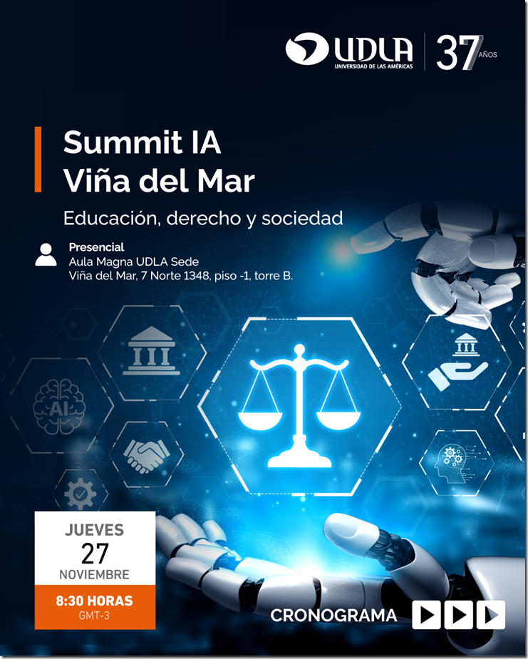 La irrupción de la inteligencia artificial (IA) desde la perspectiva de las humanidades, el desafío de educar en tiempos de algoritmos, la sociedad digital y la innovación con responsabilidad colectiva, serán los ejes centrales del “Summit IA Viña del Mar: Educación, Derecho y Sociedad” que se realizará el jueves 27 de noviembre, desde las 8:30 horas, en UDLA Sede Viña del Mar.
