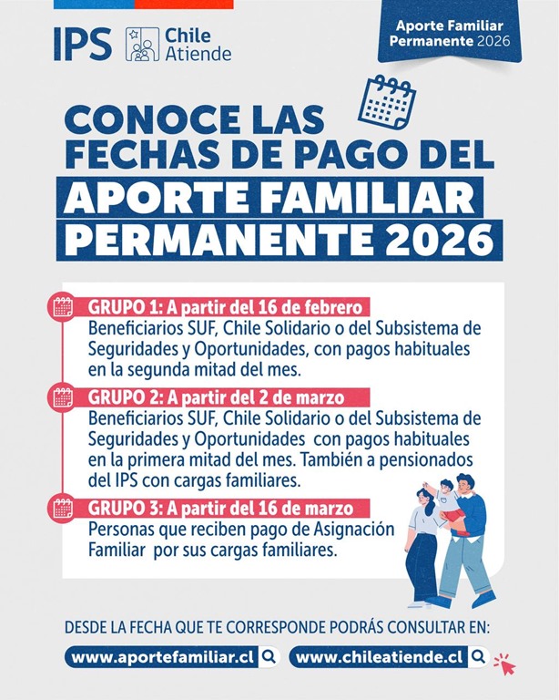 El Instituto de Previsión Social, IPS, informa que a partir del 16 de febrero se inicia el pago del Aporte Familiar Permanente 2026, ex “Bono Marzo”, al primer grupo de beneficiarias y beneficiarios. Esta primera nómina la componen personas que tenían concedido el Subsidio Familiar a diciembre de 2024 y también familias pertenecientes, a esa misma fecha, al Subsistema de Seguridades y Oportunidades (Ingreso Ético Familiar) o a Chile Solidario, y que a la vez cobran esos beneficios en forma regular en el IPS entre el 14 y 28 de febrero. El Aporte se les pagará en conjunto con su beneficio habitual, sin necesidad de nuevos trámites.