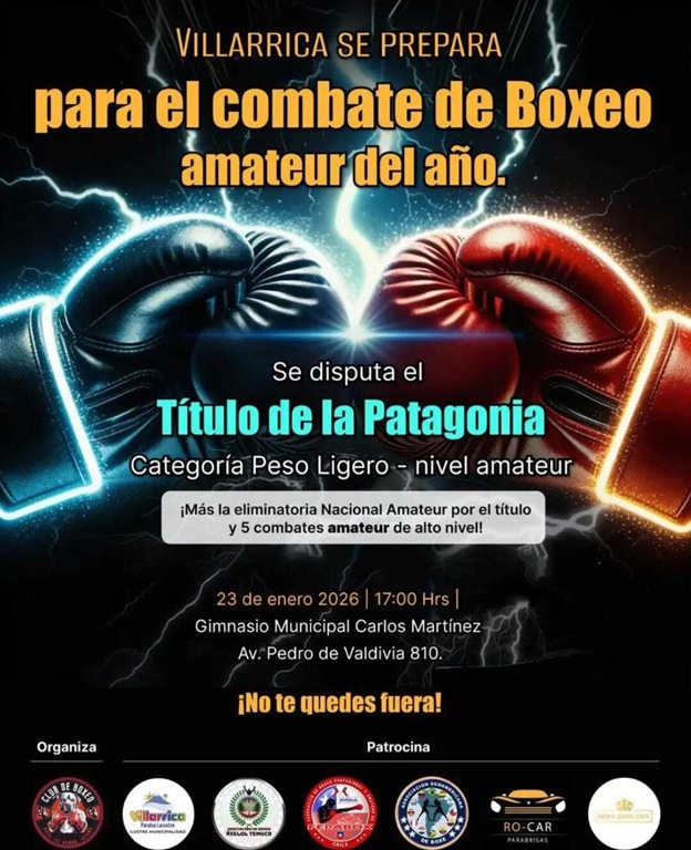 En el Gimnasio Municipal Carlos Martínez de Villarrica, se realizará este viernes 23 de enero desde las 19 hrs. el Campeonato de Boxeo Amateur, donde se disputará el Título de la Patagonia, categoría peso ligero, más la eliminatoria nacional por el título y cinco combates amateur de alto nivel, organizado por el Club de Boxeo Raúl “Perro Acuña” y el patrocinio de la Municipalidad de Villarrica.